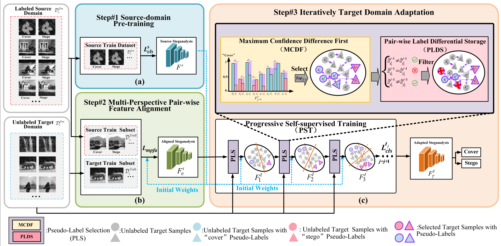 匹配场景下性能显著下降。近年来,针对不匹配隐写分析问题的研究主要集中于通过领域对抗训练或特征对齐方法提取领域不变特征,以提升跨域泛化能力。然而,这类方法在面对多样化的不匹配场景时普遍存在稳定性差的问题,甚至在某些极端条件下完全失效。为此,本文从优化目标域训练数据的角度出发,提出了一种通用的不匹配隐写分析方法,基于成对置信度差的伪标签选择策略(Pair-wise Confidence Difference-based Pseudo-Label Selection for Universal Mismatched Steganalysis, PCD-UMS)。本文通过实证研究发现,在多种不匹配场景中,成对样本间的置信度差异与隐写检测性能之间存在显著的正相关关系。基于该发现,本文设计了一种新颖的伪标签筛选机制,结合最大置信度差优先与成对标签差异存储两项策略,从目标域中选取更具可靠性的伪标签样本。此外,本文还提出了一种多视角成对特征对齐损失函数,辅助源域模型在目标域上完成初始迁移,有效缓解因领域差异过大导致的模型性能崩溃问题。大量实验结果表明,在两类典型的不匹配隐写分析场景中,PCD-UMS方法的检测性能分别相较现有主流方法提升了12.07%和3.40%,充分展示了其优越的鲁棒性与通用性。