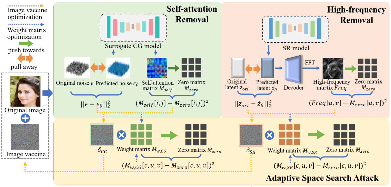 尽管扩散模型在图像生成领域展现出卓越的能力,其广泛应用也无意间为恶意滥用打开了大门。现有研究主要聚焦于防止扩散模型在定制化生成中的滥用,然而,这些方法往往忽视了另一个重要的风险源:图像细节可通过基于扩散的超分辨率技术进一步增强,从而显著增加个人图像泄露与滥用的可能性。为应对上述双重威胁,本文提出了一种名为零矩阵引导的自适应图像疫苗(Zero Matrix guided Adaptive Image Vaccine, ZMAIV)的防御框架。具体而言,本文设计了一种面向定制生成的自注意力移除策略,以破坏扩散模型对敏感区域的聚焦机制;同时,提出高频信息抑制策略,有效削弱模型在超分辨率任务中对高频细节的恢复能力。上述两种机制协同作用,从根本上限制了扩散模型对未授权图像的推理能力。此外,本文还引入了一种自适应空间搜索攻击方法,用于精确定位图像中的关键区域,并在局部注入“疫苗”扰动,以最大限度减少对原始内容的视觉干扰,同时确保防御效果。大量实验结果表明,ZMAIV在同时抵御扩散模型的定制化生成与超分辨率增强方面均优于现有主流方法,展现出在图像内容双重防护上的显著优势和广泛适用性。