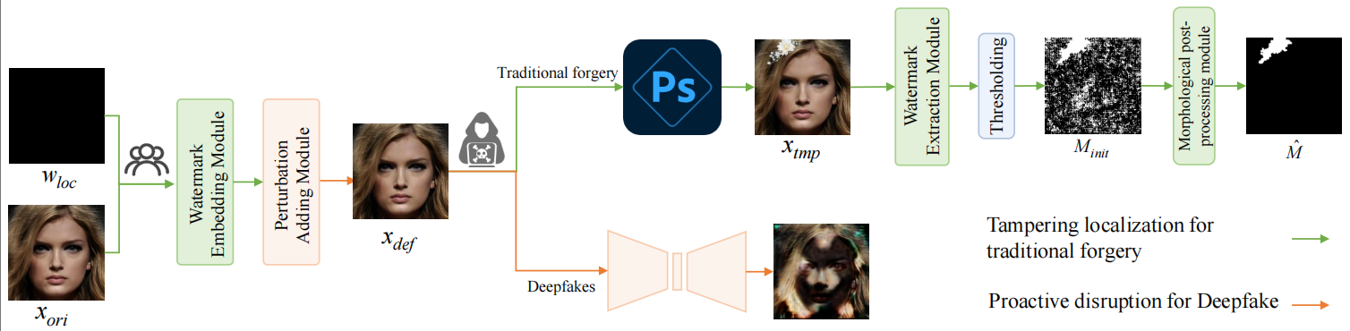 随着数字图像伪造技术的快速发展,深度伪造与传统图像篡改(如复制粘贴、图像拼接等)已成为严峻的图像安全挑战。然而,现有主动防御方法大多专注于干扰深度伪造模型,对传统图像编辑所带来的安全风险关注不足,导致实际应用中的防护能力受限。为解决该问题,本文提出了一种统一的双重伪造主动防御框架(Dual-Forgery Proactive Defense, DFPD),首次实现了对深度伪造与传统图像篡改的统一防御。具体而言,本文设计了一种基于归一化梯度集合的对抗扰动生成策略,可同时干扰多种主流深度伪造模型(包括 SimSwap、StarGAN、FGAN 和 FaceShifter),显著提升跨模型的防御泛化能力。同时,本文引入可逆神经网络对脆弱水印进行嵌入,实现无需原图即可精确定位图像中的篡改区域,增强系统对传统图像编辑操作的检测与响应能力。为进一步提升篡改定位的准确性,DFPD 采用“先水印、后扰动”的串行处理流程,并结合形态学后处理模块,有效缓解对抗扰动可能引发的误检问题。实验结果表明,DFPD 框架在深度伪造防御任务中,较现有最优方法提升了 19.78% 的PSNR;在传统图像篡改检测中,定位准确率提升了 8.25%,同时保持 32.75 dB 的图像视觉质量。