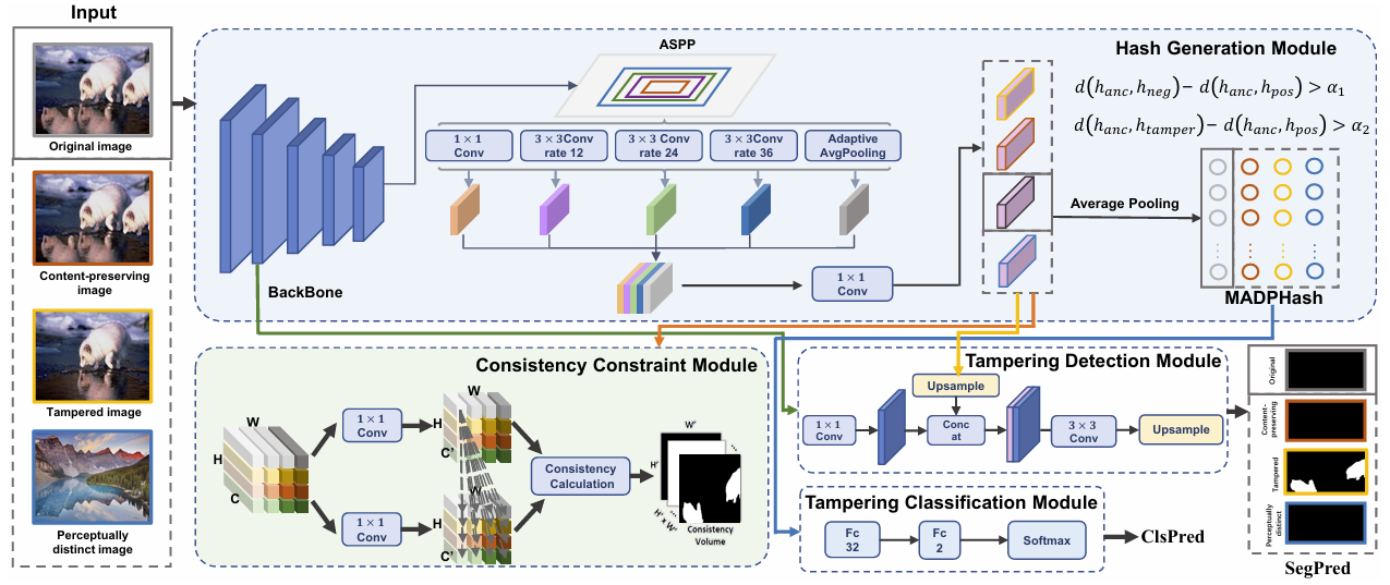 现有的感知哈希方法在处理小区域图像篡改方面表现有限,难以实现有效的篡改识别与定位。被篡改图像通常仅在局部区域发生变化,整体仍保持与原始图像高度相似的表征,进而加大了感知哈希对篡改区域的识别难度。因此,如何增强感知哈希对细微篡改的敏感性,并在保持感知鲁棒性的同时提升篡改区分能力,已成为感知哈希研究中的关键挑战。为应对这一问题,本文提出了一种基于特征一致性的深度感知哈希框架(MADPHash)。该方法将特征一致性分析与篡改检测任务融合至哈希生成过程中,并引入一致性约束模块,以放大篡改与未篡改区域之间的特征差异,从而提升对局部篡改的感知能力与区分精度。在四个主流基准数据集上的综合实验结果表明,MADPHash在检测细微图像篡改方面显著优于现有先进方法,同时保持对内容保持性变换的良好鲁棒性,展现出更强的实用性与推广潜力。
