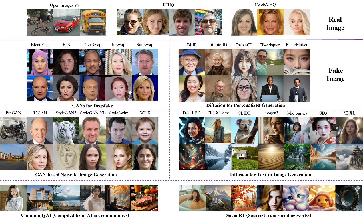 AIGIBench中使用的评估数据集中真实图像和生成图像的可视化