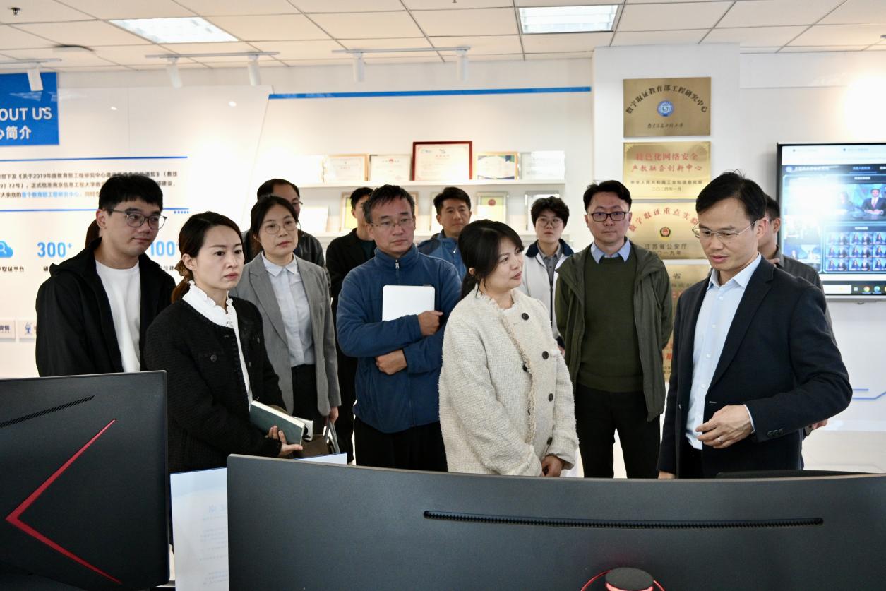 胡婧一行首先参观了取证中心研发大厅,现场观摩了多媒体内容篡改检测工具、跨平台网络态势感知系统的实操演示,了解取证中心在电子数据取证、区块链存证等领域的技术实力与实战应用场景,对取证中心相关研究成果和技术给予高度认可。